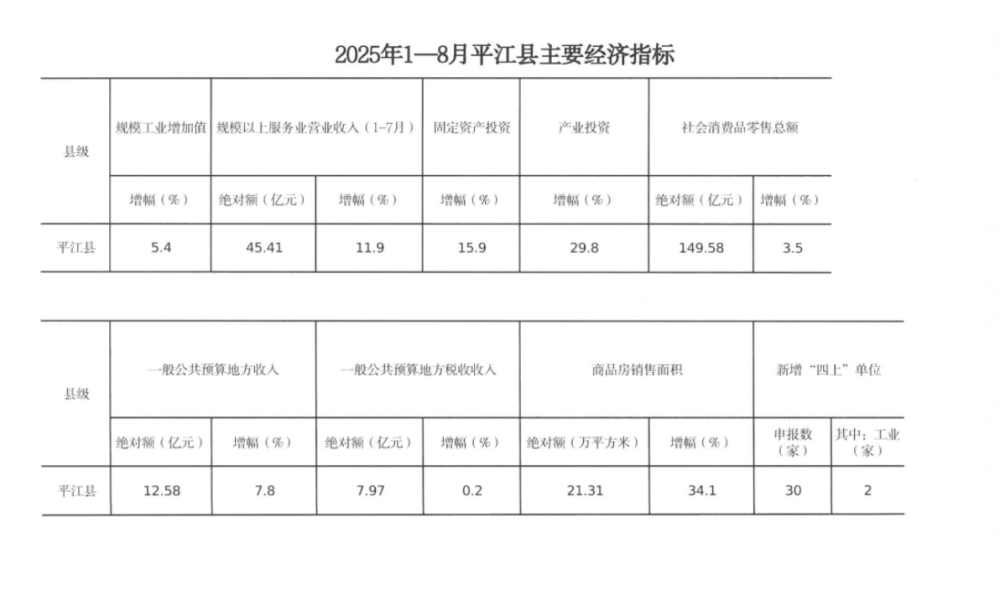 2025年1—8月平江县主要经济指标