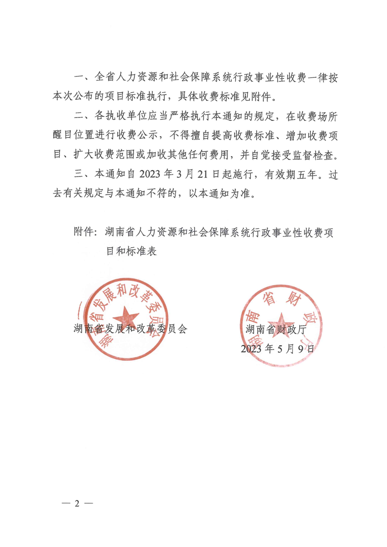关于公布湖南省人力资源和社会保障系统行政事业性收费标准的通知(湘发改价费规[2023]284 号)