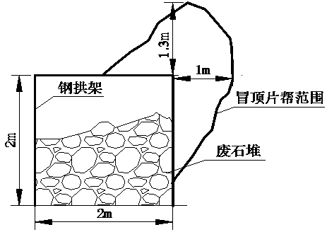 根据事故现场勘察,8号穿脉东平巷长度为17.5m,净断面宽2.0m、高2.0m,巷道采用工字钢拱架支护,工字钢间距为1.0m~1.2m,工字钢横梁间搭有工字钢、木材等形成护顶,上部充填有袋装碎石,钢拱架间设有连筋,钢拱架支架距离巷道端部(工作面)约1.5m未支护,巷道右侧3组钢支架间侧帮未设置挡板并进行壁后充填。