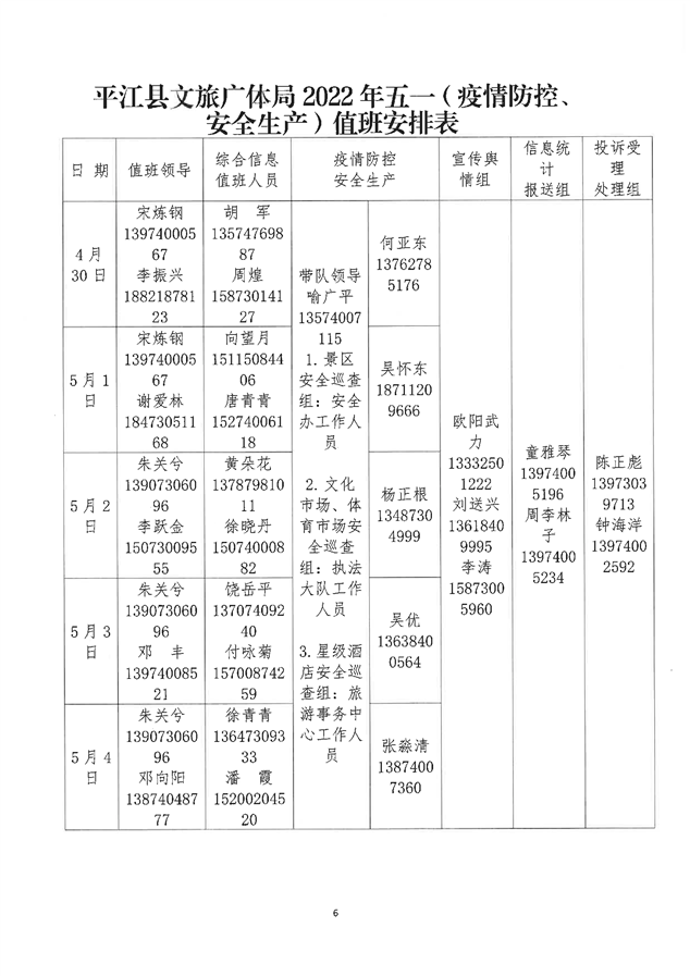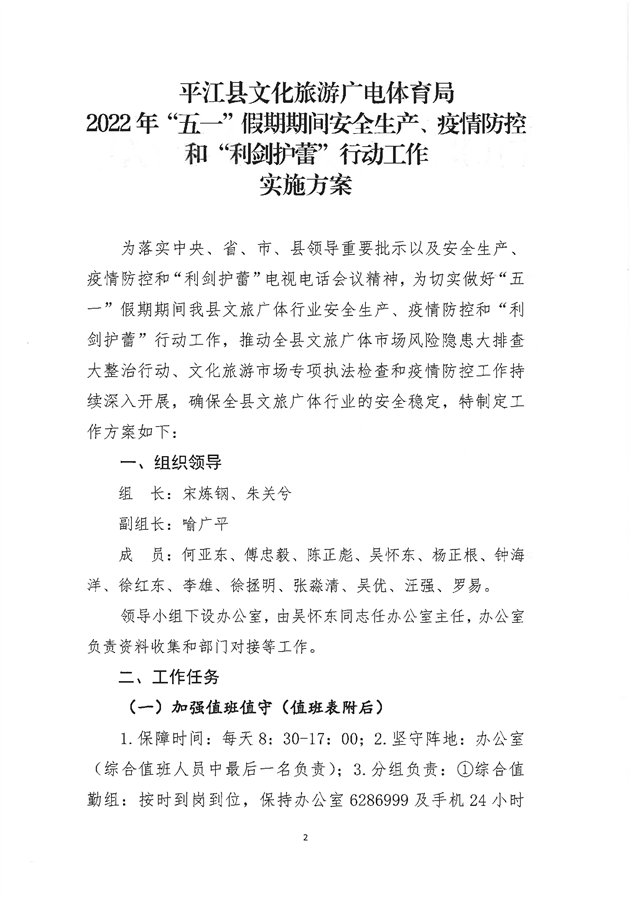 关于印发《平江县文化旅游广电体育局2022年“五一”假期期间安全生产、疫情防控和“利剑护蕾”行动工作实施方案》的通知