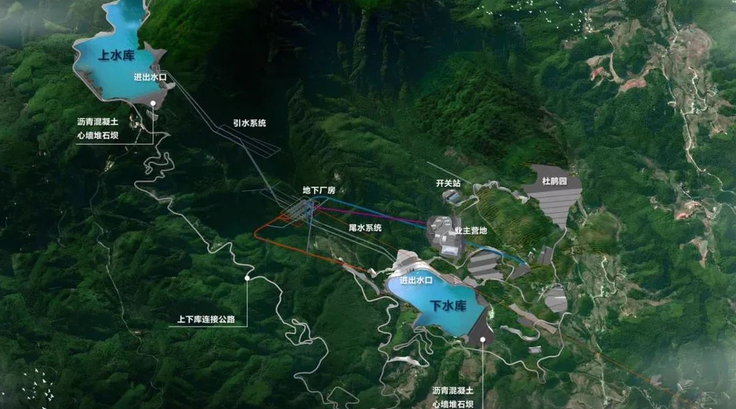 平江抽水蓄能电站项目位于福寿山镇百福村,占地4642亩,总装机140万千瓦,安装4台单机容量35万千瓦可逆式水泵水轮发电机组,设计年抽水电量19.66亿千瓦时,设计年发电量14.74亿千瓦时。电站枢纽由上水库、下水库、输水系统和地下厂房系统组成总投资88亿元。项目建设分为主体工程、施工辅助工程、移民安置工程、环境保护工程四大部分,总工期72个月,预计2024年建成投运、2025年全部投产发电。