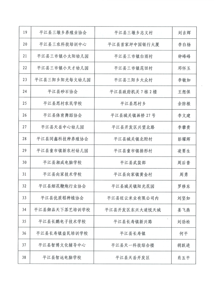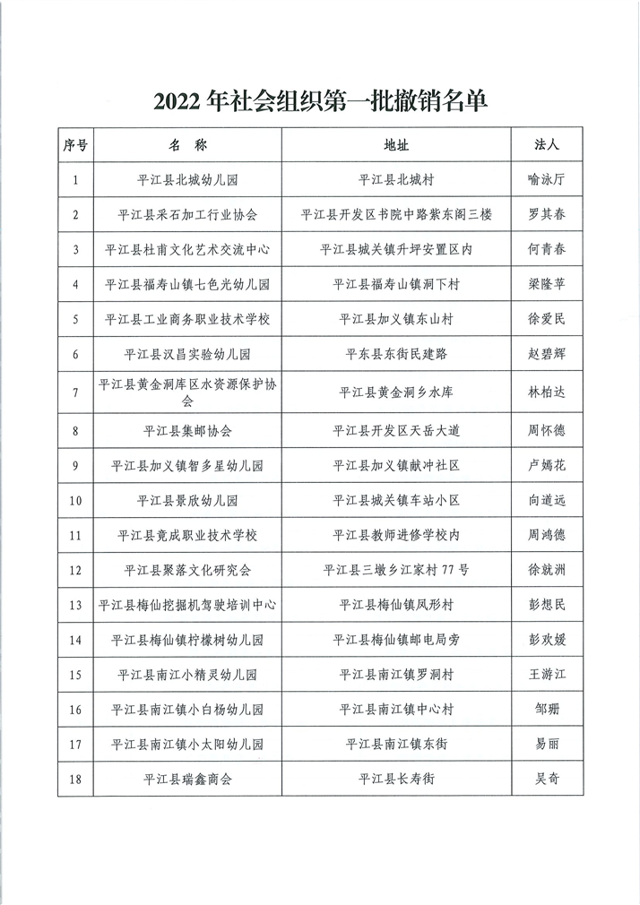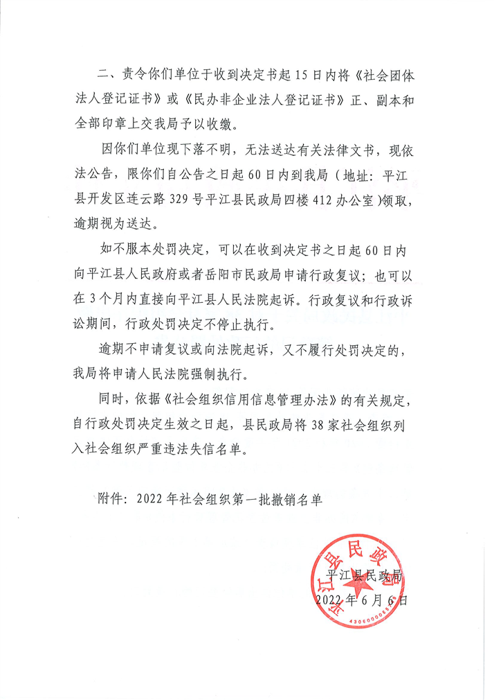 平江县民政局关于对38家社会组织作出撤销登记的行政处罚公告