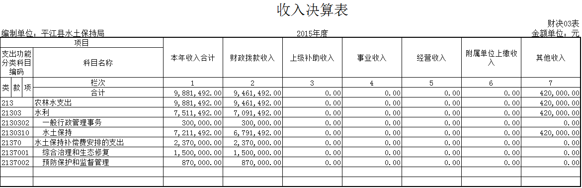 决算收入与预算收入差异大的原因是:年中追加了:土保持长石矿区治理100万元,2015年革命老区项目省级配套50万元,县级配套50万元,新建汨江源径流场25万元,湘水计[2015]117文国家水土保持重点建设工程生态清洁小流域建设实施计划的通知下达项目资金585万元。