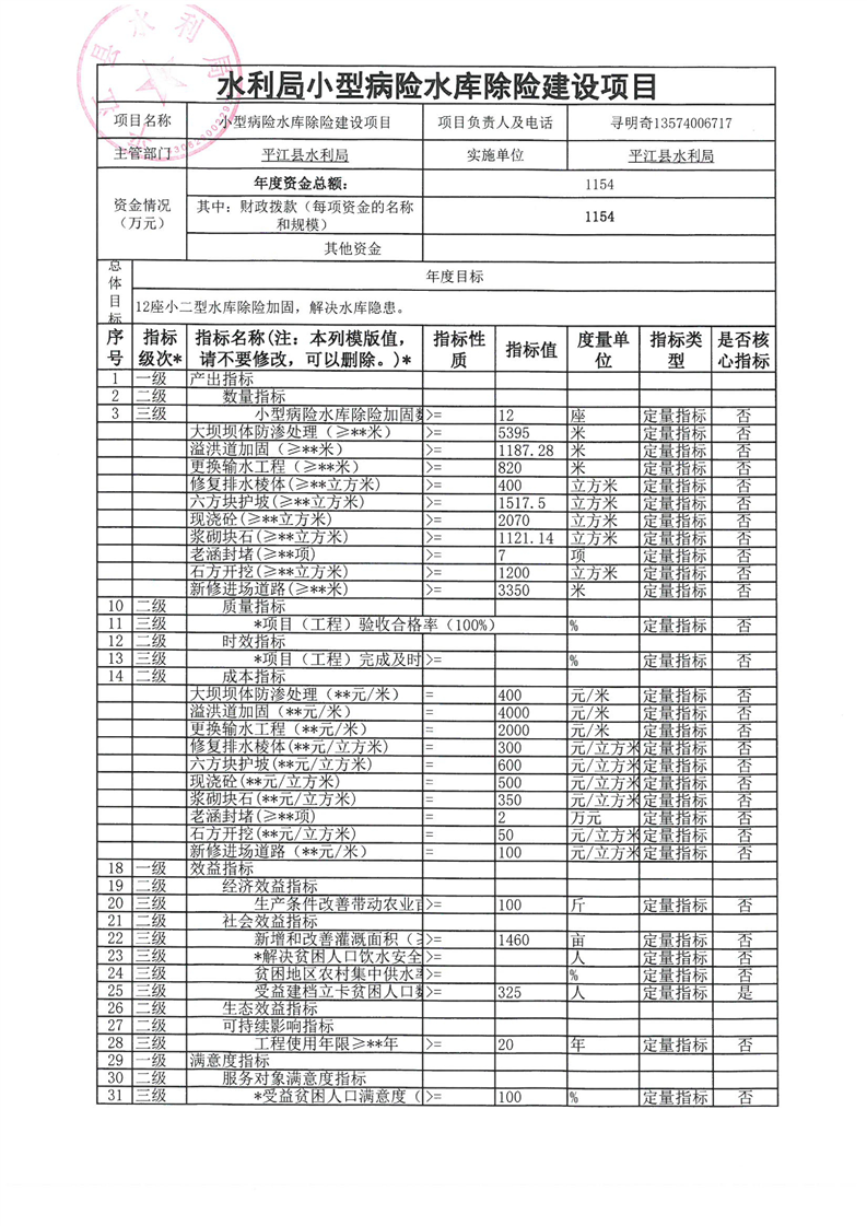 2020年小型病险水库除险加固项目绩效目标申报表