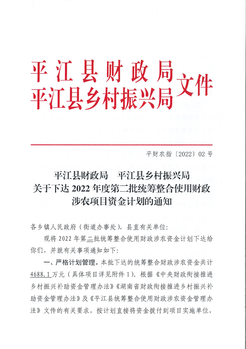 平财农指〔2022〕02号 关于下达2022年度第二统筹整合使用财政涉农项目资金计划的通知