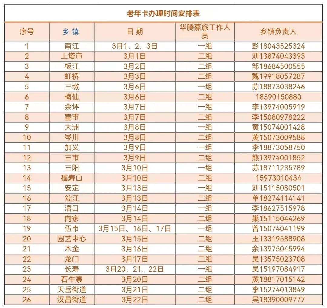各乡镇办卡时间安排如下: