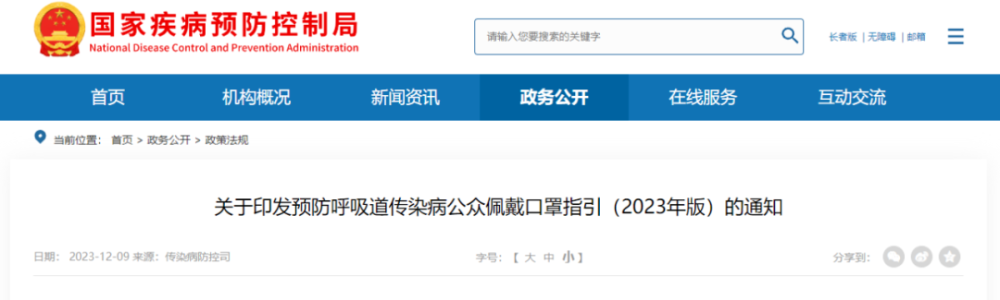 同时,国家疾控局官网还发布了《预防呼吸道传染病公众佩戴口罩指引(2023年版)》政策解读